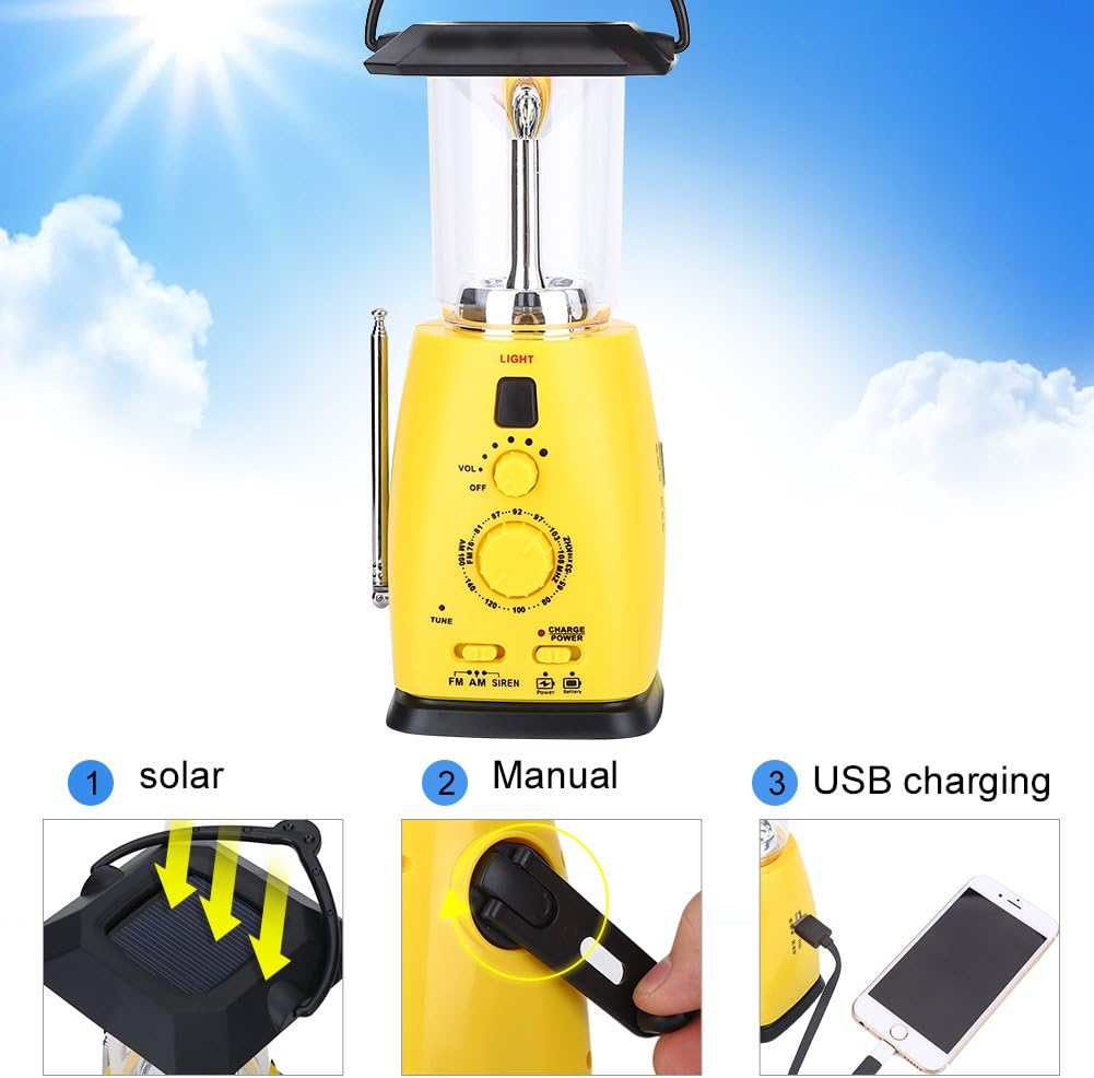 Specification: Material: Plastic Color: Yellow Function: Lamp - LED Power Bank - DC Out 5V Radio - FM:87.5---108MHZ OR 76---90MHZ / AM:20-1650KHZ Power Supply Type: Solar panel - 5.5V/35MAH (5.5V/35MAH) mo Generator - 5.5V/350MAH + (120-140 / per minute) Direct charging - DC IN/USB IN 5V (Built-in battery 500MAH/3.7V) Battery - 3 * AAA1.5V batteries (not included) Method: Solar; Manual; USB charging Charging Time: Solar - 15-25 hours; USB - 5 hours Working Time: 4-8 hours Lamp Function Specification: LED Bead Quantity: 8 pcs LED : 15,000-18,000 Luminous Flux: 55-60 lm Mode: High; Low/Energy-saving Total Size (L*W*H): Approx. 8 x 8 x 25cm / 3.15 x 3.15 x 9.84inch Weight: Approx. 450 g Package List: 1 * Multi-function Lamp (without AAA battery) 1 * USB Cable Noted: 1. Please turn off cellphones and other devices be Replacement fore you it with this item. 2. Replacement for LED lamp, press the button once, it's in energy-saving mode, press it twice, it's in high brightness mode, press it again, it turns off. 3. Replacement for the radio, first pull out the antenna, and turn the AM/FM switch and turn the knobs Replacement for channel and volume adjustment. 4. Replacement for mo generator, please keep the rotation between the range of 120-140.